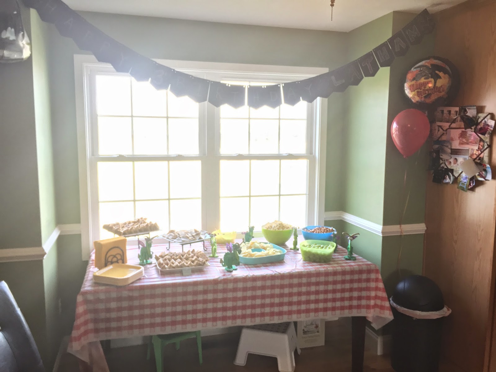 The main creative activity I planned was a Dragon Egg Hunt. Two of Latham's favorite dragons, Toothless and Percy, had hidden easter eggs outside in our yard. The goal was for the kids to find all the little easter eggs and then they would all then receive some bigger, glittery "dragon" eggs with stickers and raisins inside. It worked really well, and the kids seemed to have a blast!